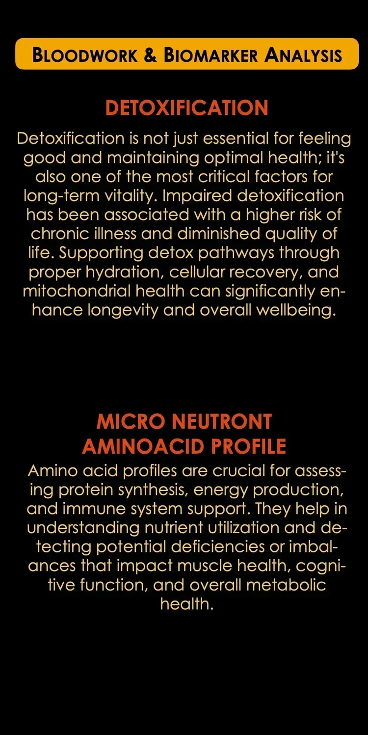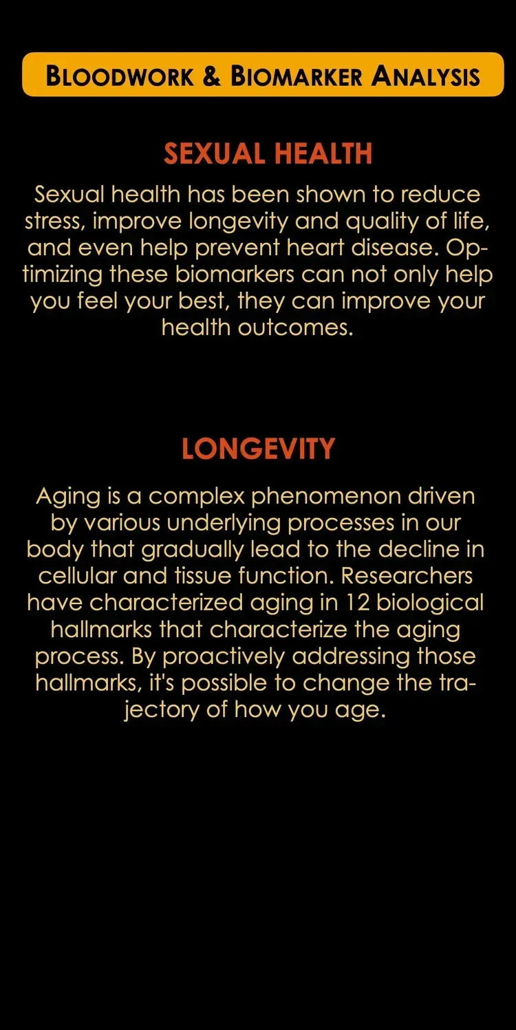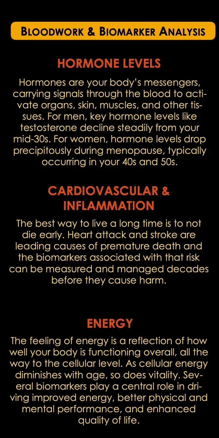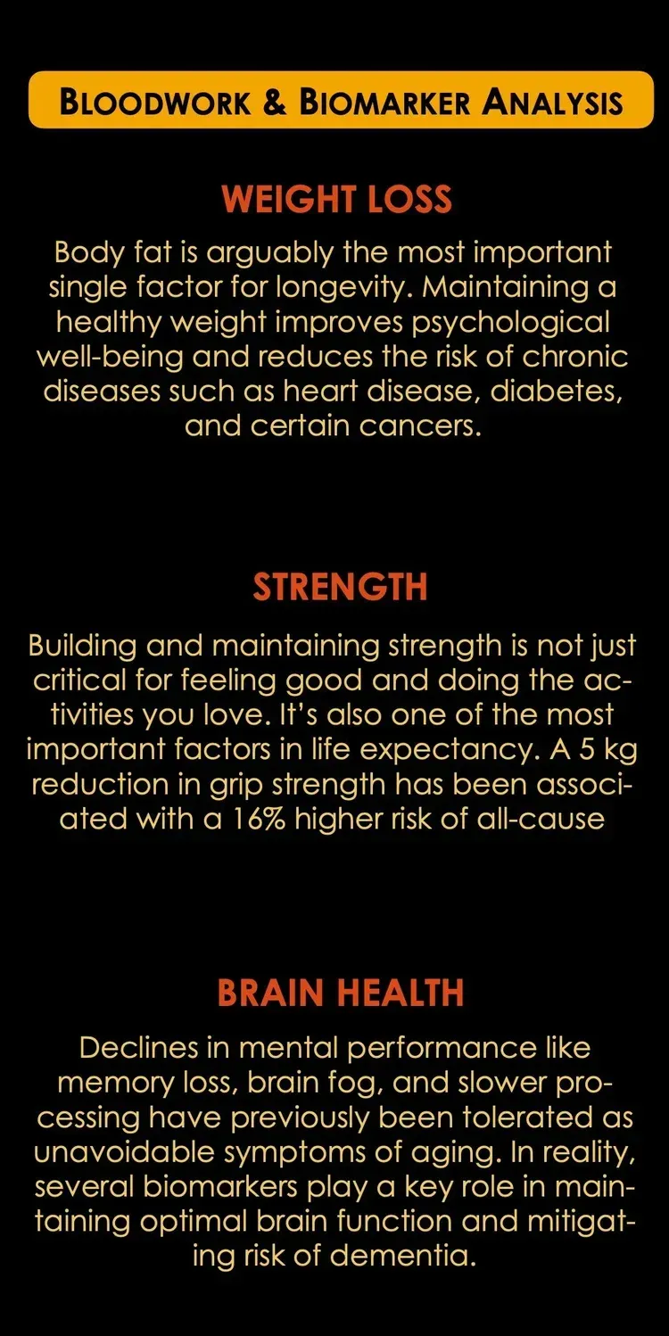Biomarkers, like glucose or total cholesterol, are measured from a blood draw. They can explain how you’re performing in pillars of healthspan such as metabolism and heart health. Biomarkers are impacted by your lifestyle choices (including diet and exercise) and your genetics. They offer a unique and unbiased look at whether your current lifestyle is working for you or against you.