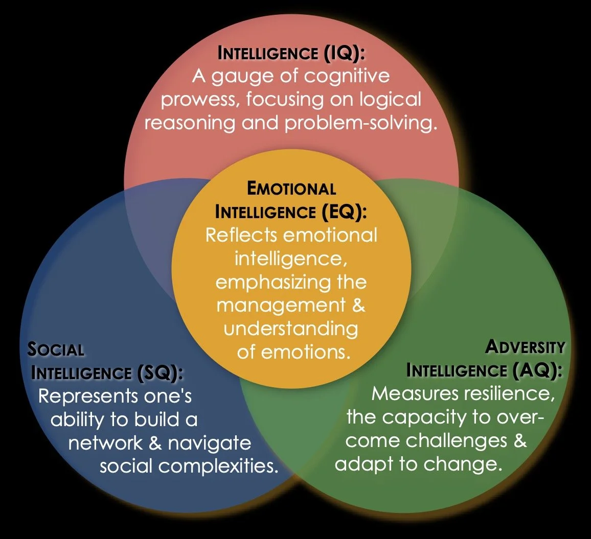 Your pathway to empowerment is driven by optimizing your Emotional Intelligence (EQ), which involves managing your emotions and understanding those of others. This is enhanced by the intersection of three other spheres of intelligences: IQ, Social Intelligence (SQ) — which involves building networks and navigating social dynamics, with Adversity Intelligence (AQ) — the ability to overcome challenges and maintain a positive outlook.