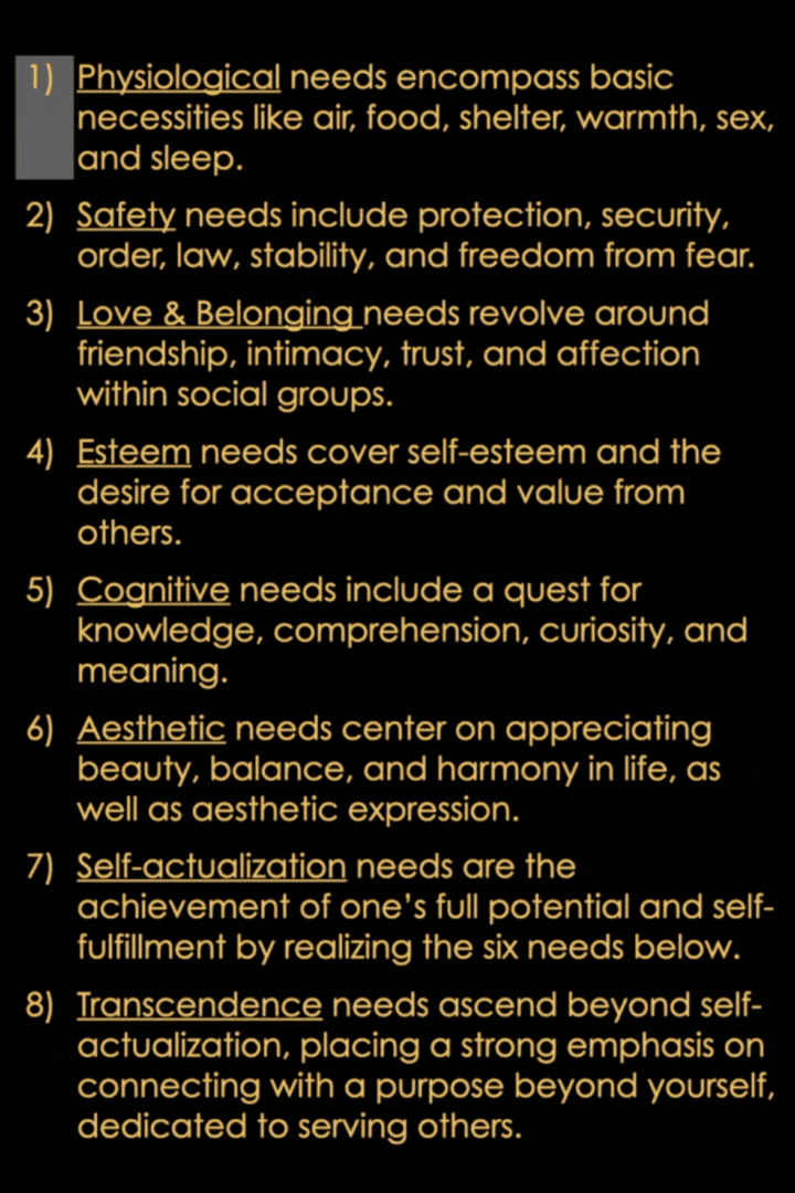 Our curriculum provides a structured sequence to enhance learning efficiency and reduce the likelihood of members playing pinball and going on a "self-guided tour." This billiards-like sequence is informed by the Eight Motivational Needs (table below). It aligns with a hierarchical structure, satisfying physiological, safety, love, esteem, cognitive, aesthetics, self-actualization, and transcendence needs.